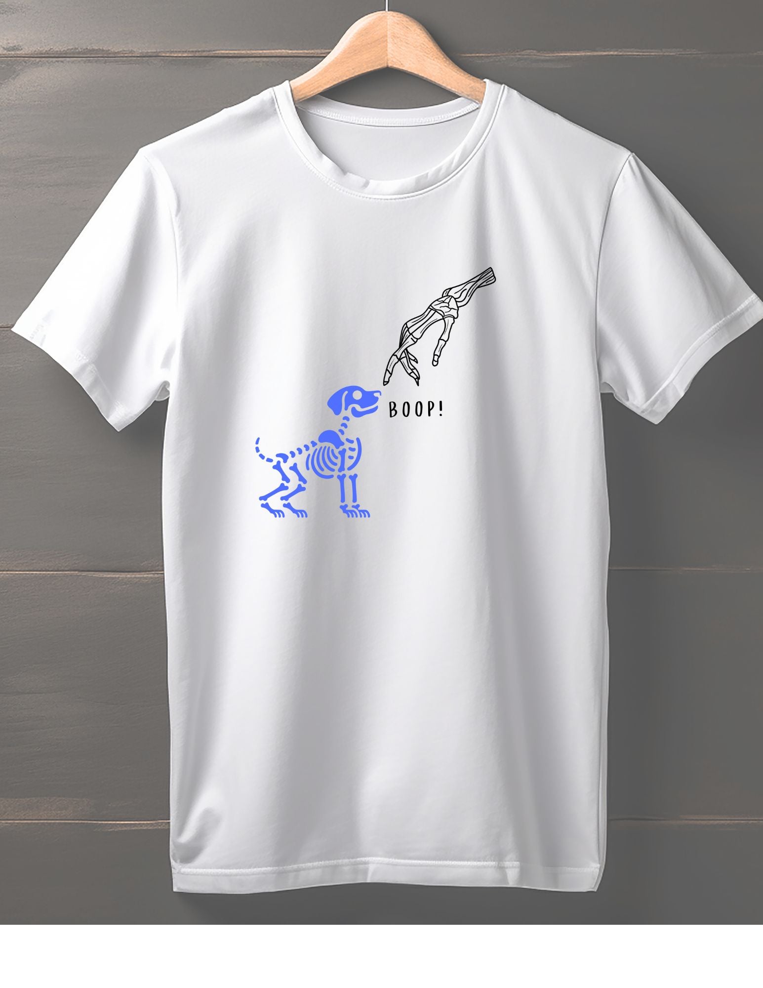 This playful T-shirt showcases a skeleton hand gently touching a skeleton dog’s nose with the fun word “BOOP” below. It’s a quirky, lighthearted design perfect for adding a touch of spooky charm and humor to your wardrobe. Comfortable and eye-catching, it’s great for anyone who loves unique, whimsical styles.