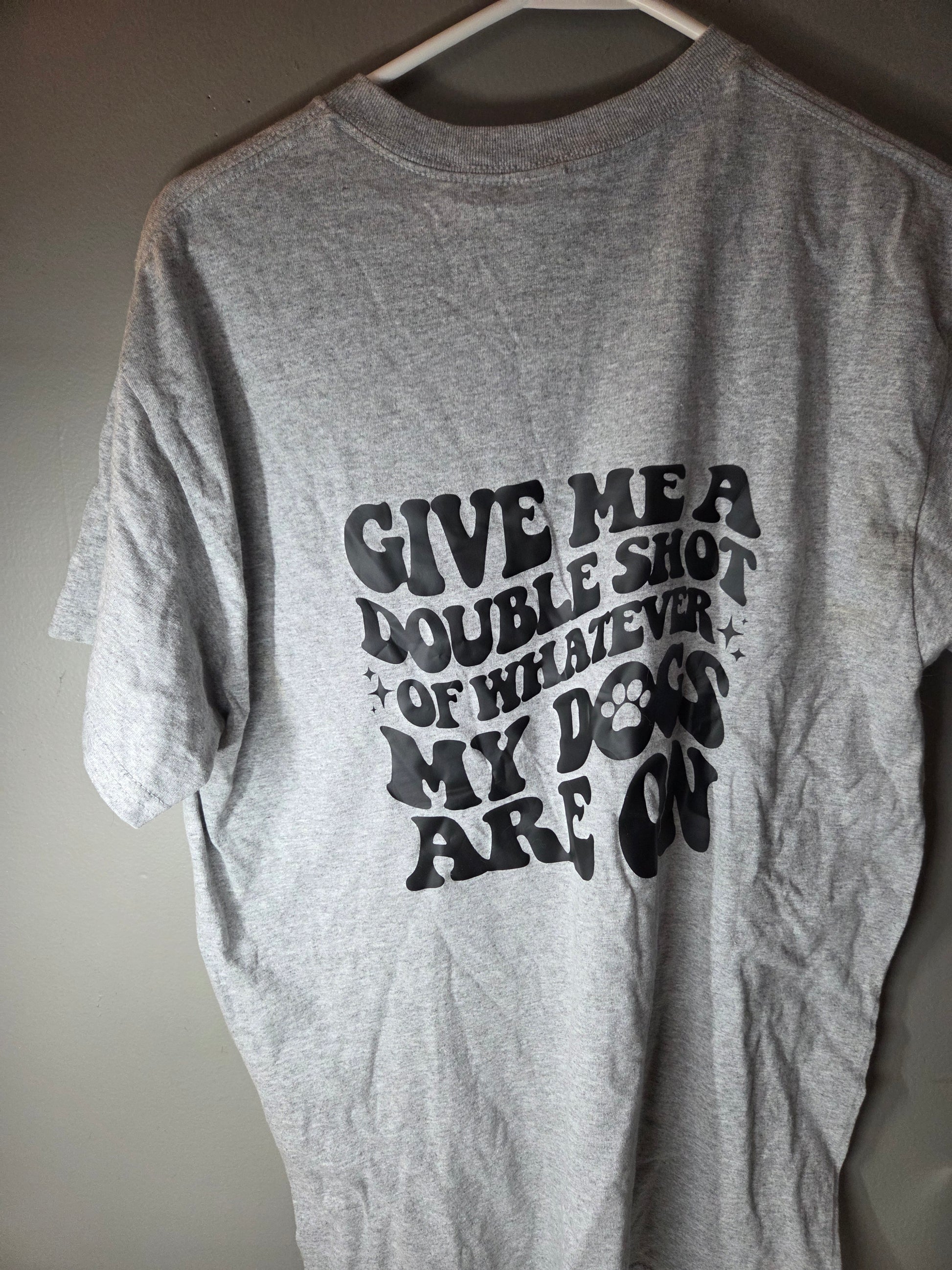 Show off your love for your furry friends with this playful Dog Short Sleeve T-Shirt. Featuring the hilarious quote, "Give me a double shot of whatever my dogs are on," it’s perfect for anyone who knows that dogs have a secret to a stress-free life. Comfortable and casual, this tee is sure to bring smiles and laughs wherever you go. Great for dog lovers who want to add a fun twist to their everyday style.