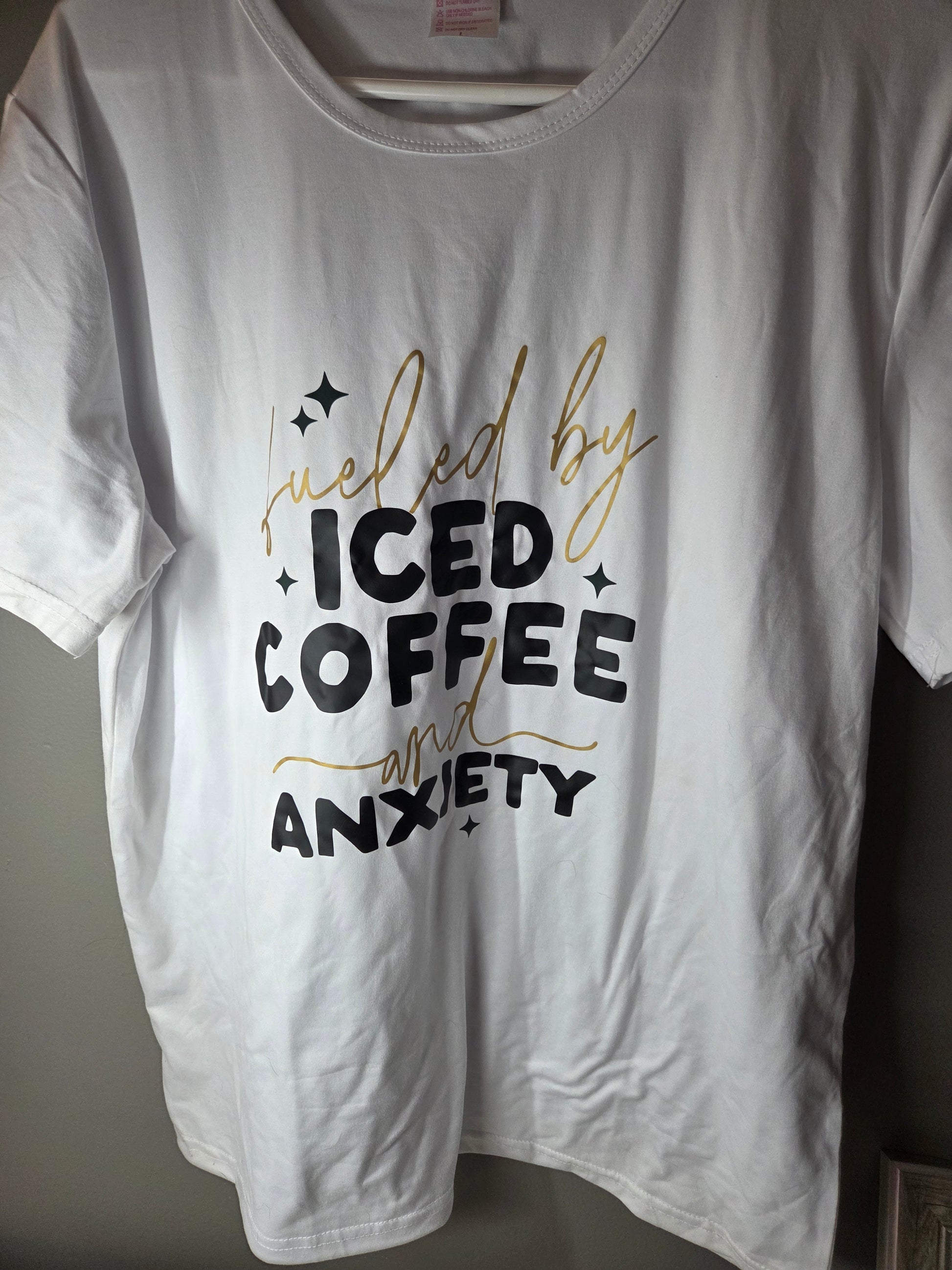 Energize your day with this playful Short Sleeve T-Shirt featuring a witty "Fueled by Iced Coffee & Anxiety" design accented with sparkling diamond graphics. Perfect for expressing your quirky charm while staying comfortable and casual, this tee adds a fun twist to your everyday wardrobe.