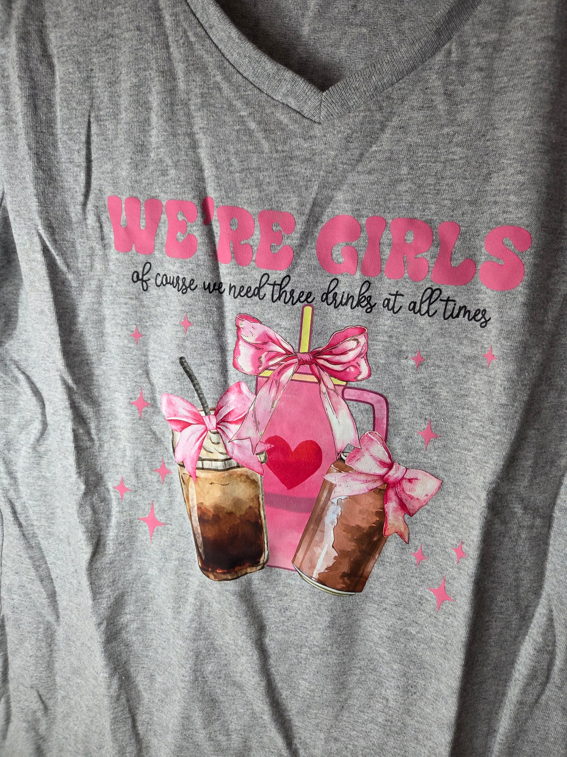 Celebrate girl power with this playful short sleeve t-shirt featuring the quote, "We're girls, of course we need 3 drinks at one time." Adorned with three colorful drinks and plenty of pink accents, it’s the perfect fun and vibrant tee for your next outing with friends. Comfortable and stylish, it adds a cheeky touch to your casual wardrobe.